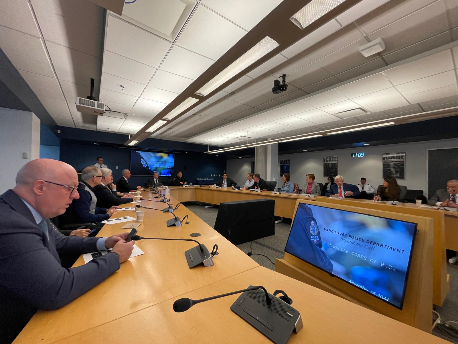 به تاریخ 14 نومبر 2024، نشستی در مقر اداره پولیس ونکوور با اشتراک جنرال قونسلان کشور های مختلف مقیم ونکوور، برگزار شد. در این برنامه، آقای رامین معنوی جنرال قونسل افغانستان نیز اشتراک داشت و با مقامات ذیربط دیدار نمود. در این نشست، اداره پولیس ونکوور در مورد همکاری آن اداره با نمایندگی های قونسلی مقیم ونکوور، فعالیت های اداره مذکور در زمینه مبارزه با جرایم، بررسی و تحقیقات جنائی، حفاظت از جوامع آسیب پذیر و سایر موارد مشابه معلومات ارائه کرد. اشتراک کنندگان نیز نظریات و پرسش های خویش را در موارد مربوط مطرح نمودند.