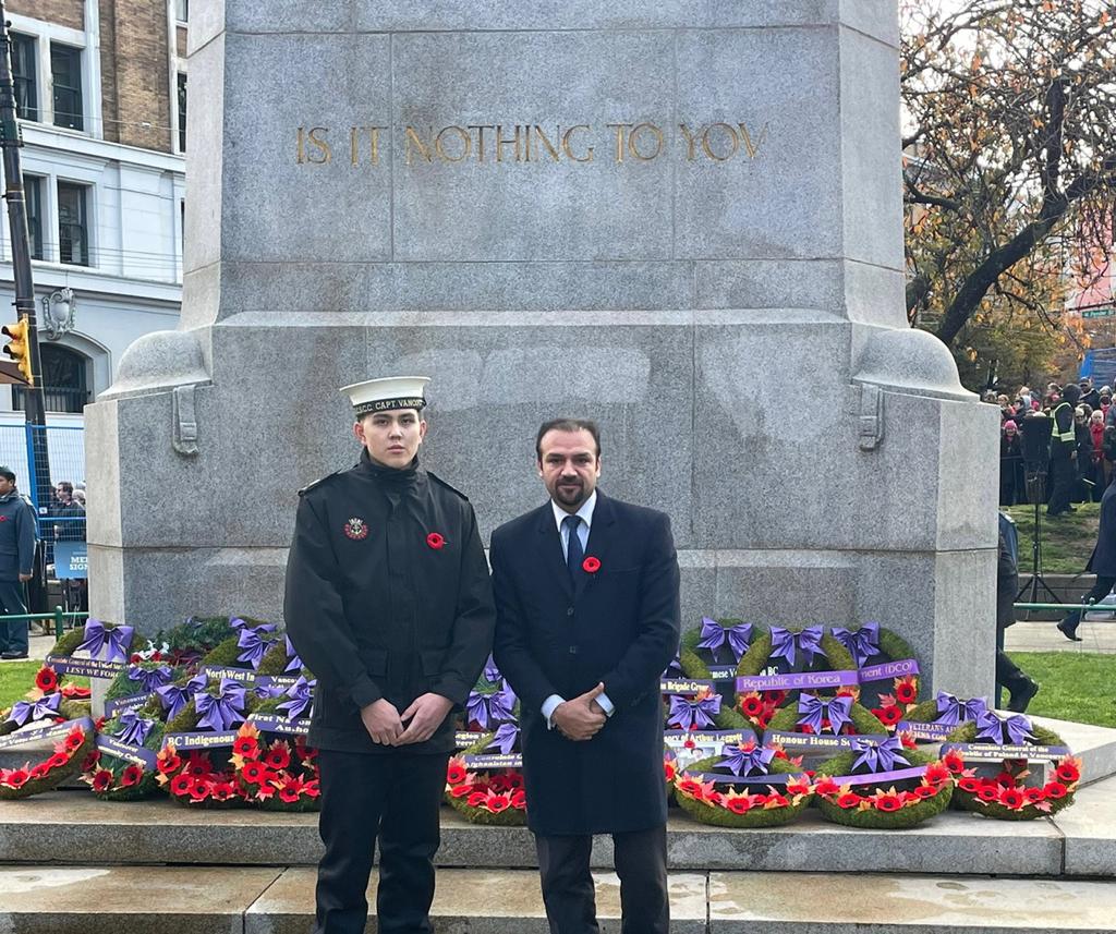 On Saturday, November 11, 2023, a solemn Remembrance Day ceremony was held in Vancouver, by the presence of thousands including key Canadian government figures. Mr. Ramin Manawi, Afghanistan's Consul General also attended among fellow Consuls General of other countries, representing Afghanistan by placing a wreath at the Victory Square Cenotaph.