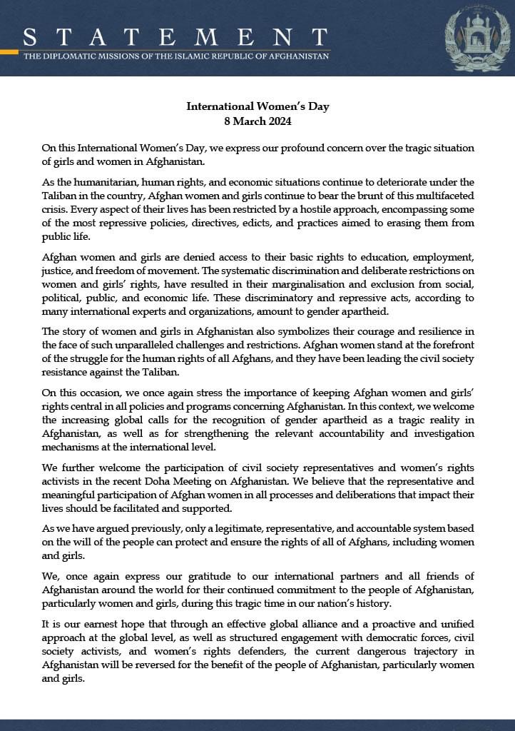 Statement by the Coordination Council of the Diplomatic and Consular Missions of the Islamic Republic of Afghanistan on International Women’s Day