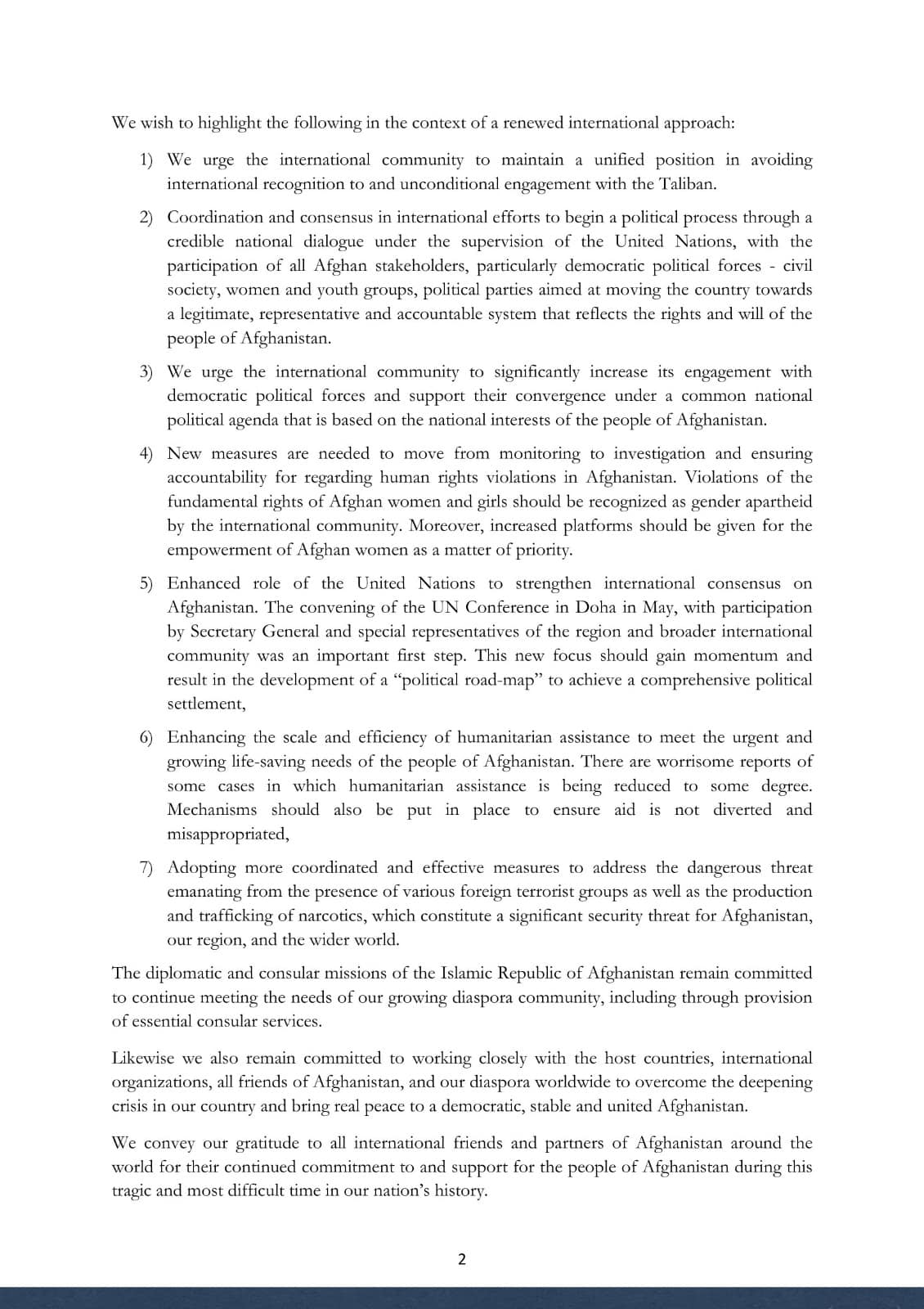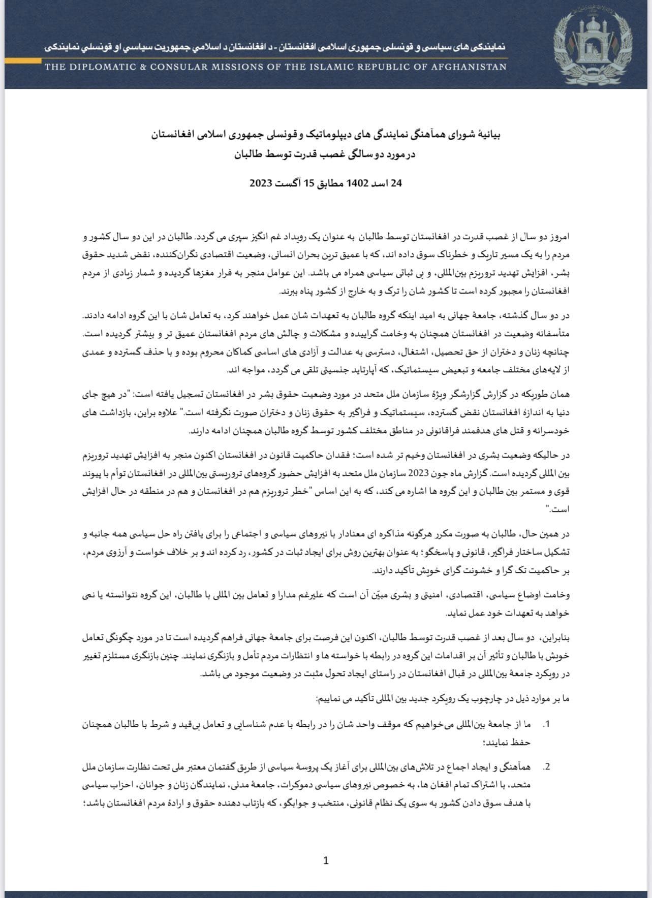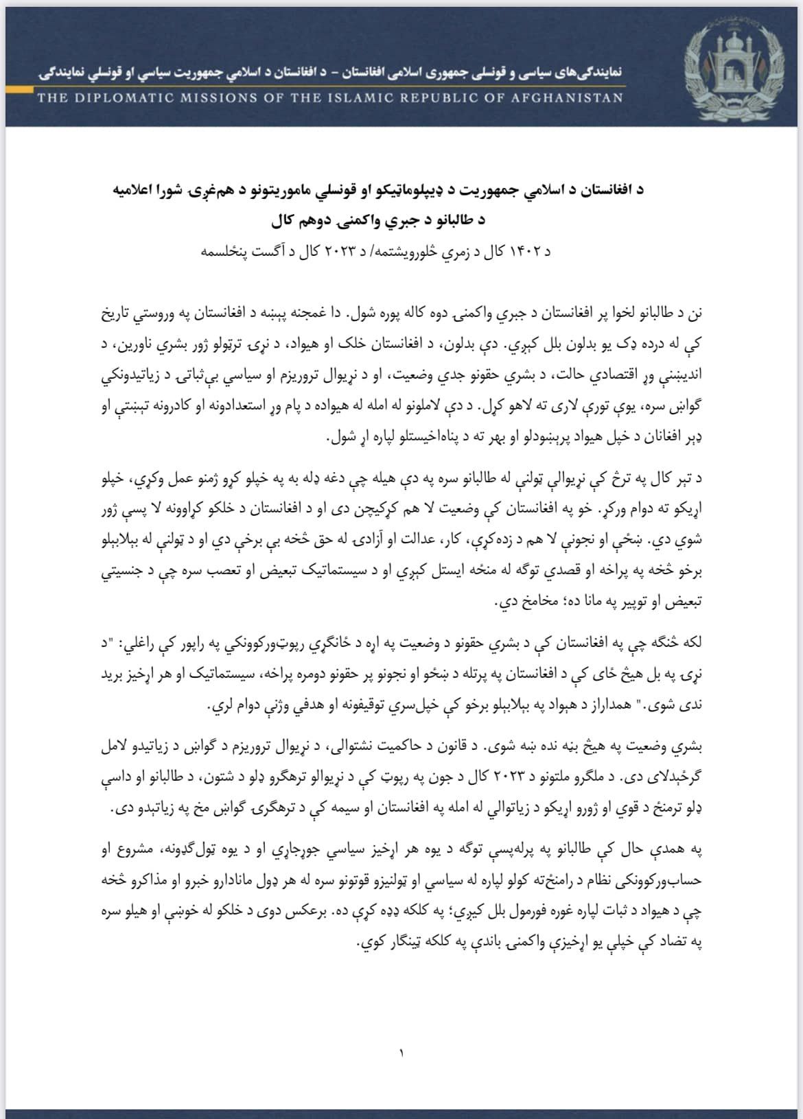 Statement of the Coordination Council of the Diplomatic and Consular Missions of the Islamic Republic of Afghanistan on the  Two-Year Mark since the Taliban’s Forced Takeover of Afghanistan